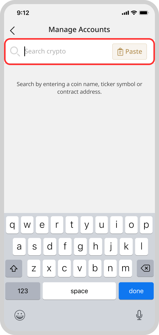 - 검색 필드에 코인, 토큰 이름 또는 토큰의 계약 주소(ERC20(이더리움) 및 BEP20(바이낸스 스마트 체인)에만 해당)를 입력합니다.